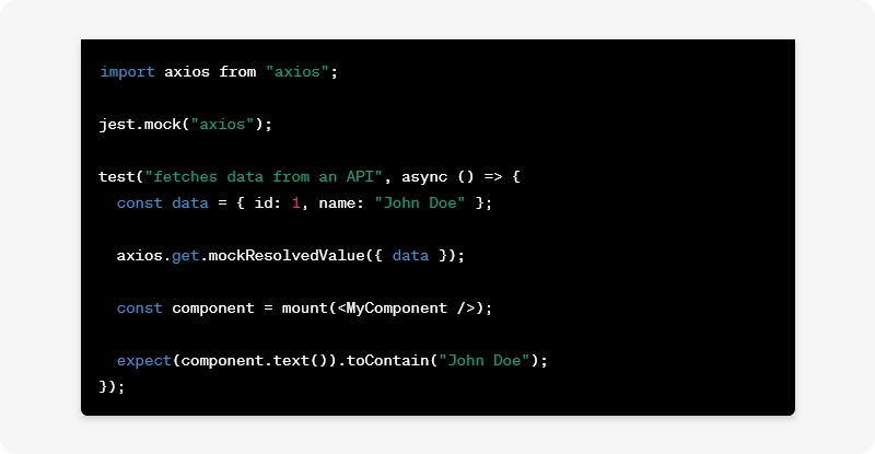 In this example, we’re mocking the axios library and telling it to return a specific object when the get method is called. We’re then rendering our component and checking whether it contains the data we expect.