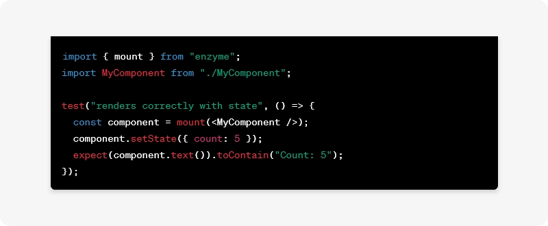 In this example, we’re setting the component’s state and checking whether it renders the correct output.